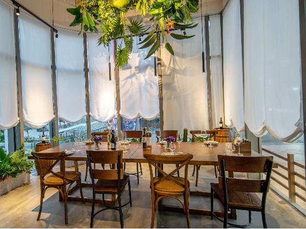 餐廳內(nèi)部的綠植為就餐氛圍增添無限生機,在自然光的折射下,粗獷的紅磚搭配柔和的燈光與原木質(zhì)感的家具,共同營造了人與自然、與空間互動的環(huán)境, 讓就餐成為一場撩撥視覺、味覺、聽覺和觸覺的極致體驗 。