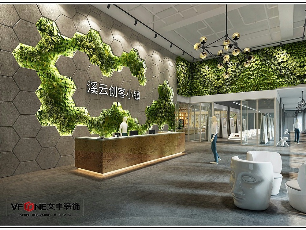 為了貼近當(dāng)?shù)氐沫h(huán)境,設(shè)計(jì)師在辦公區(qū)中安排了大量植物,前臺(tái)溪云小鎮(zhèn)包圍在植物組成云朵中,用多個(gè)六變形組成背景墻,塑造科技感,將“溪云小鎮(zhèn)”的含義體現(xiàn)出來。